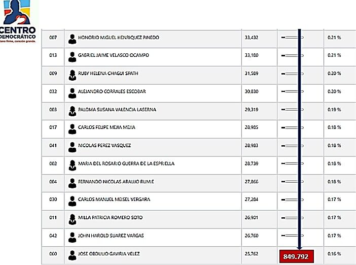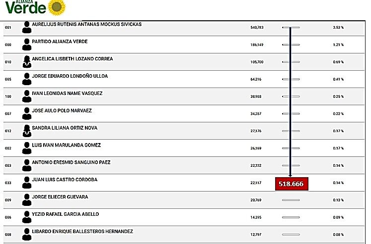 Y para no alargar el cuento estadístico, vean al último que entró en el Partido Verde, nada menos que el hijo de Piedad Córdoba, llegó con poco más de 22.000 votos.